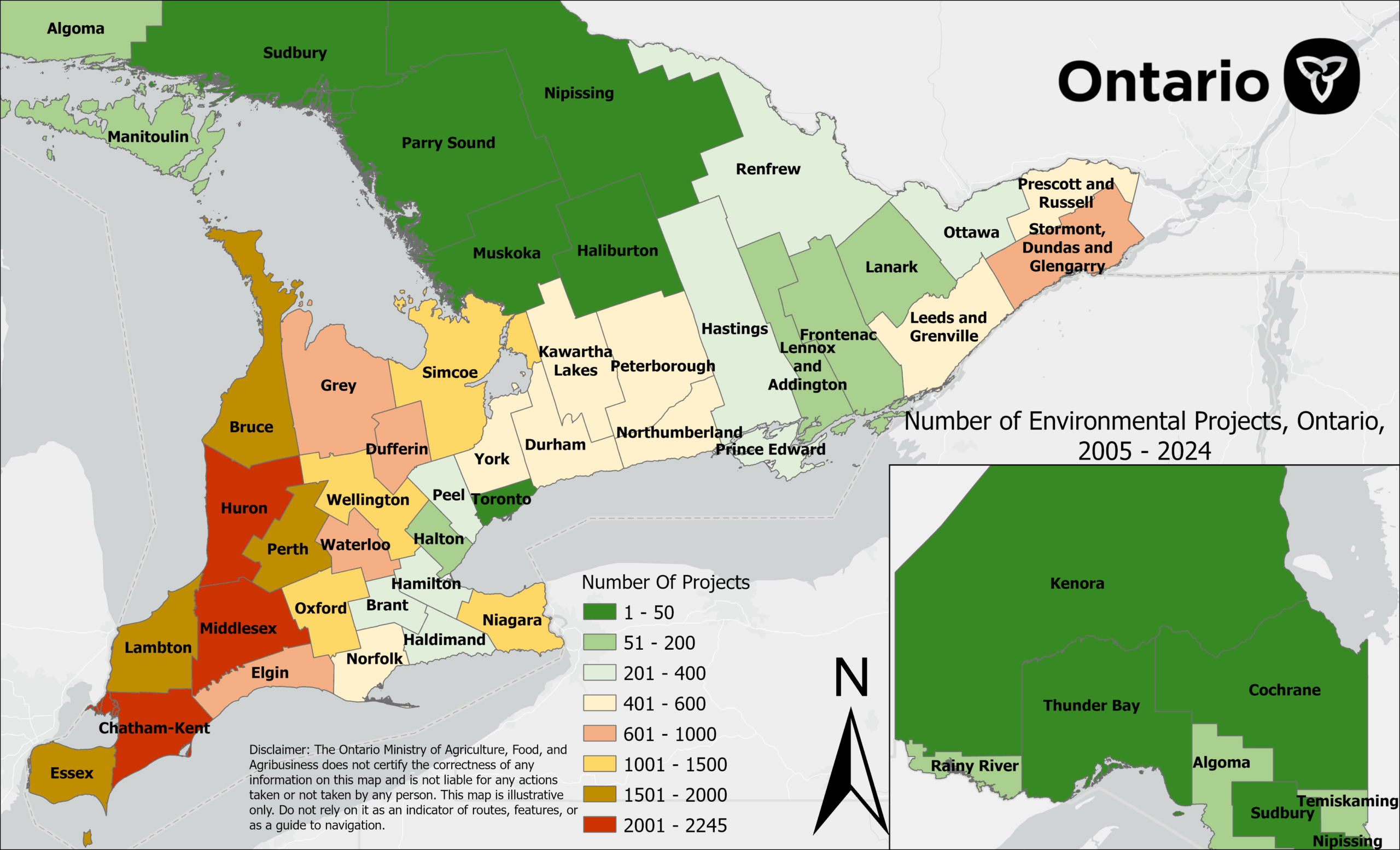 Figure 1. Number of completed On-farm Environmental Projects by Municipality (2005-2024) (source: OMAFRA, Guelph, Ontario).