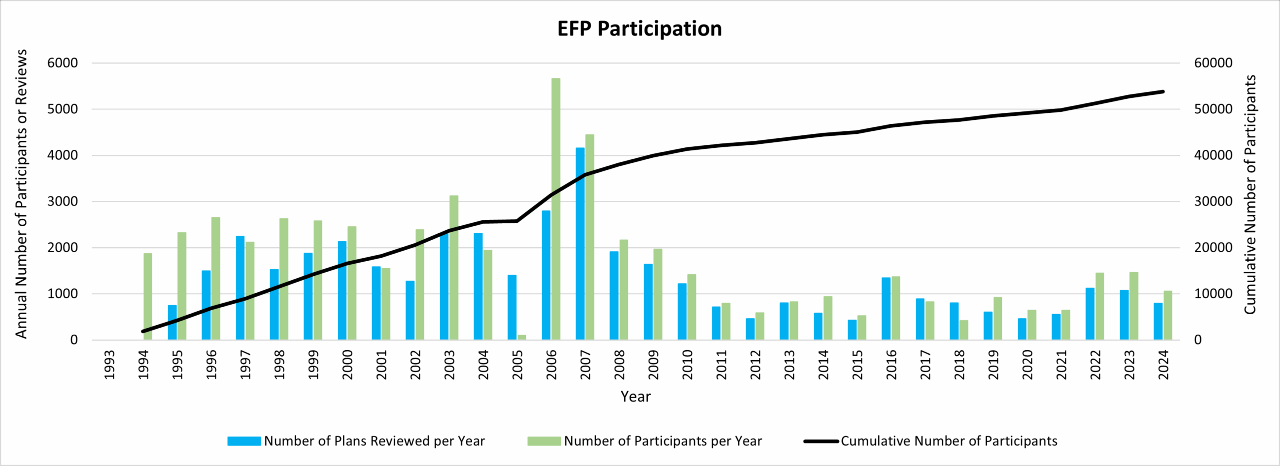 - From 1992 to 2024 there were over 53,000 participants in the EFP, including those who were updating a previous EFP (Figure 2), with more than 9,300 participating since the 2015 State of Ontario’s Biodiversity report.